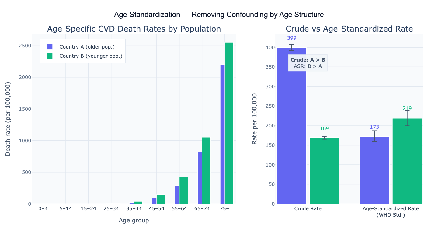 A classic example: Country A has a crude cardiovascular disease (CVD) death rate of 250 per 100,000, while Country B has a crude rate of 190 per 100,000. But Country A has an older population. After direct standardization to the WHO standard population, Country A's age-standardized rate is 175 per 100,000 and Country B's is 205 per 100,000 — the ranking reverses, revealing that Country B actually has higher underlying CVD risk once age structure is removed from the comparison. Without age standardization, this reversal (Simpson's paradox) would be invisible.