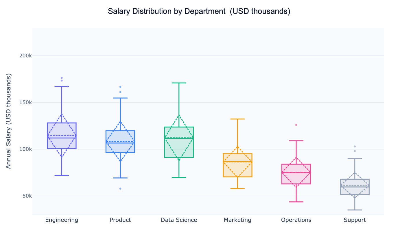 | Department salary comparison | box plot of salary by department, color by department, show outliers |