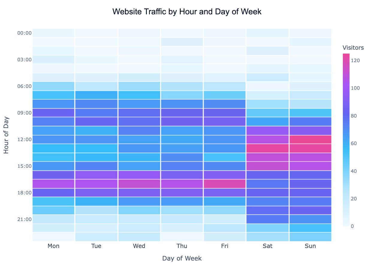 | Website traffic | heatmap of page views by hour of day (rows) and day of week (columns) |