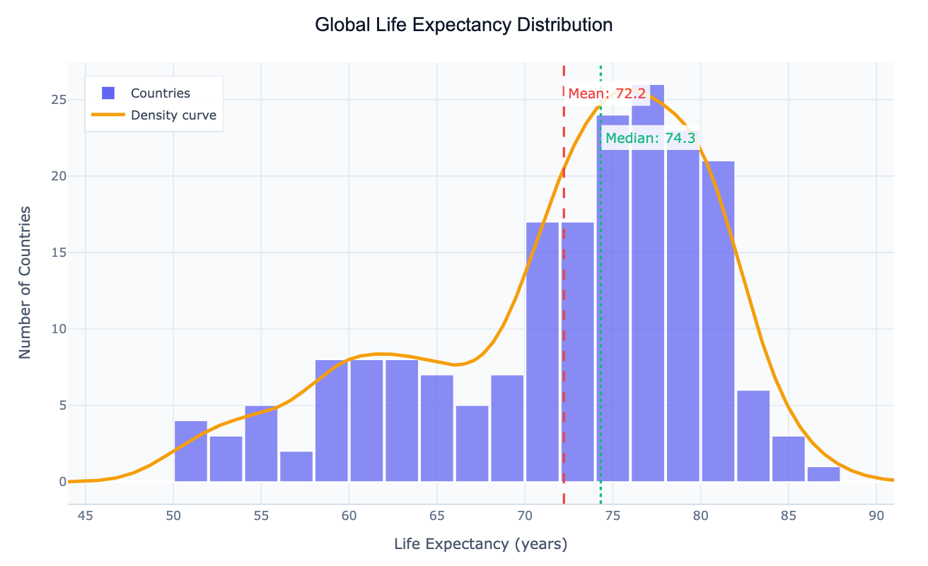What is a KDE (kernel density estimate)? A KDE is a smooth curve overlaid on a histogram that estimates the underlying probability distribution. Ask for "histogram with KDE curve" to add it.
