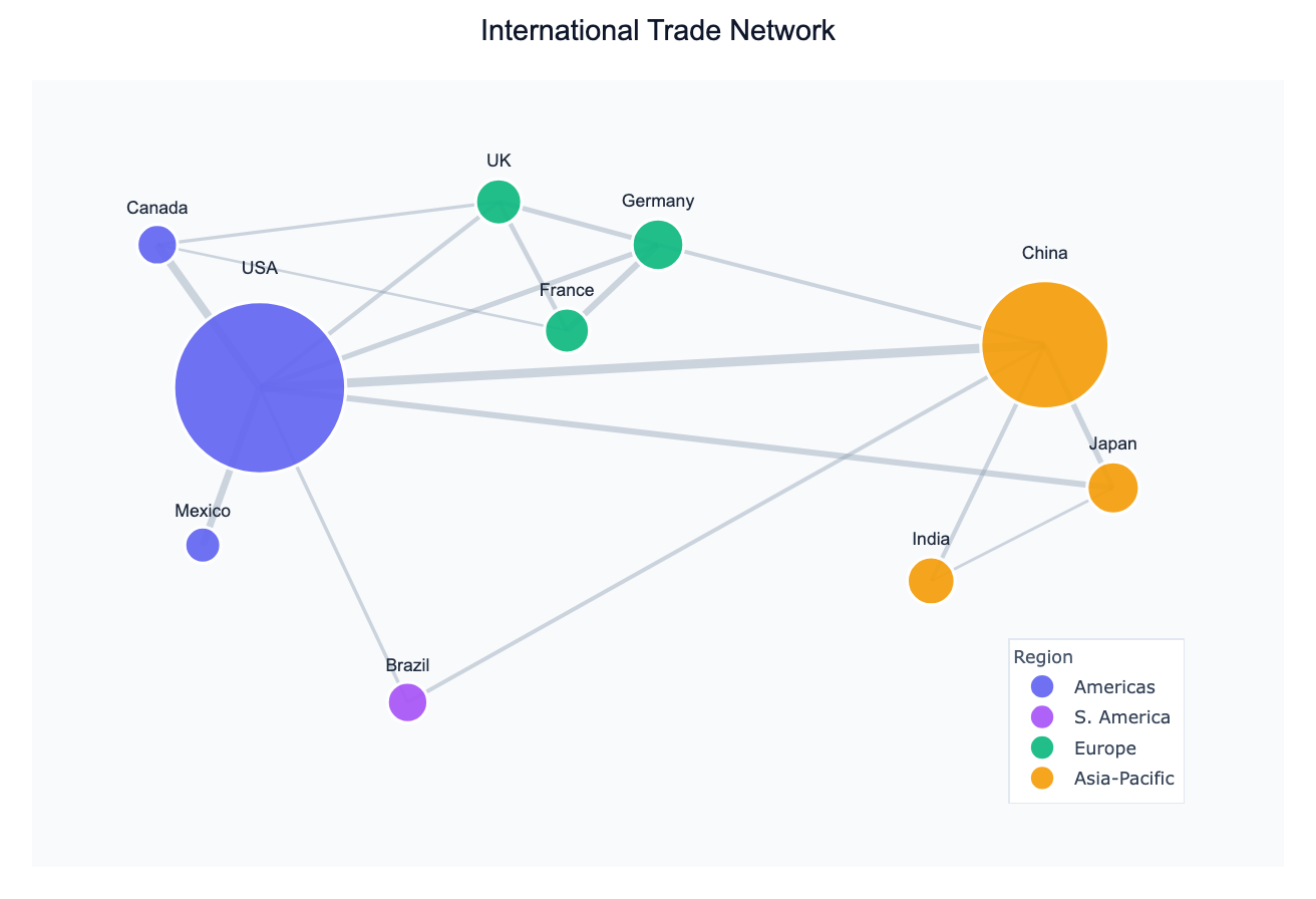 | Edge thickness | Proportional to the weight of the relationship (e.g. trade volume) |