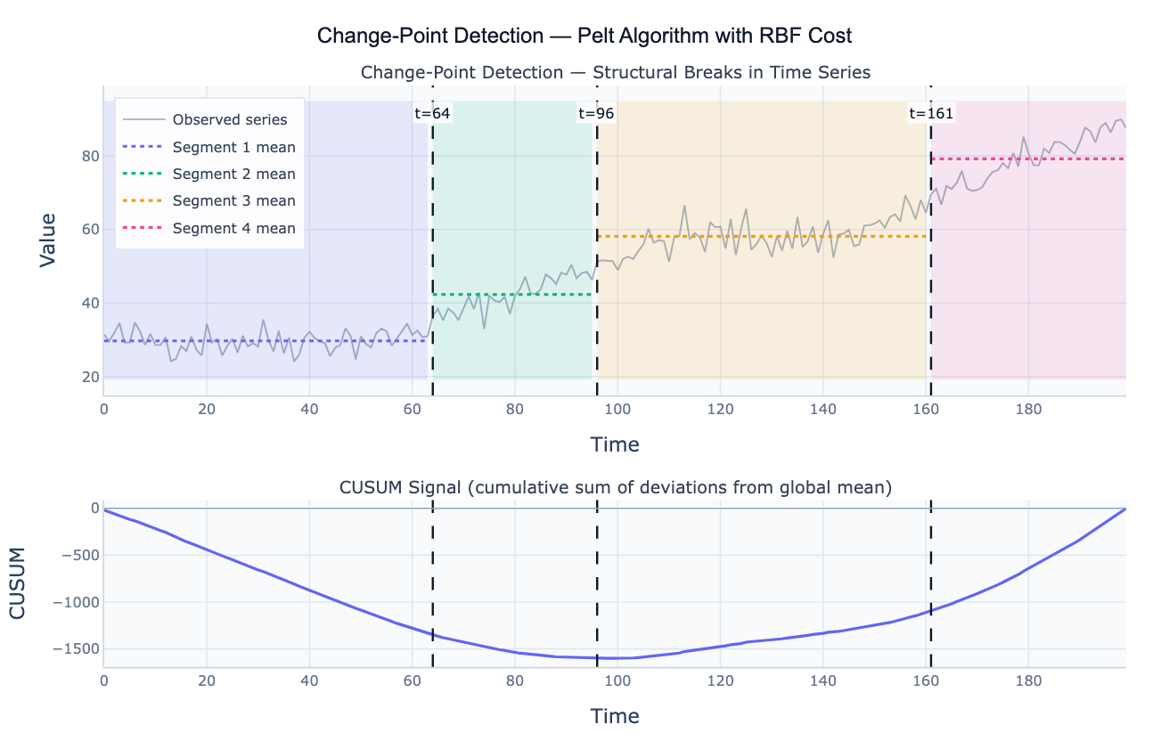Change-point detection (also called structural break detection) identifies the moments in a time series where the underlying statistical properties shift abruptly — the mean jumps to a new level, the variance changes, the trend reverses, or the entire distributional regime switches. These transition points are called change points or breakpoints. Unlike gradual trends detected by a trendline, change points are sudden and discrete: before the break, the series behaves one way; after it, a fundamentally different pattern takes hold. Identifying these moments answers questions like "when did growth accelerate?", "when did volatility regime shift?", or "at which point did the policy intervention take effect?"