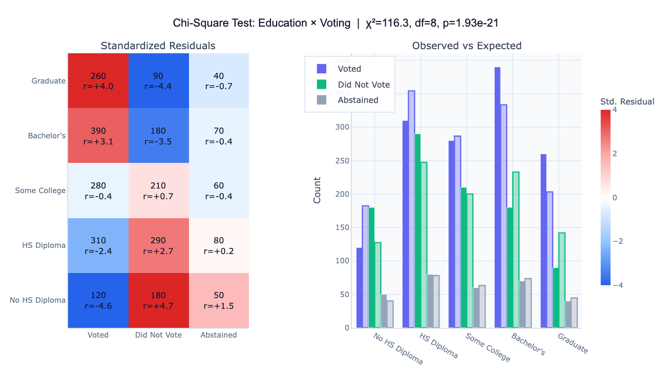| Standardized residual | (observed − expected) / √expected — values beyond ±2 indicate a notable cell |