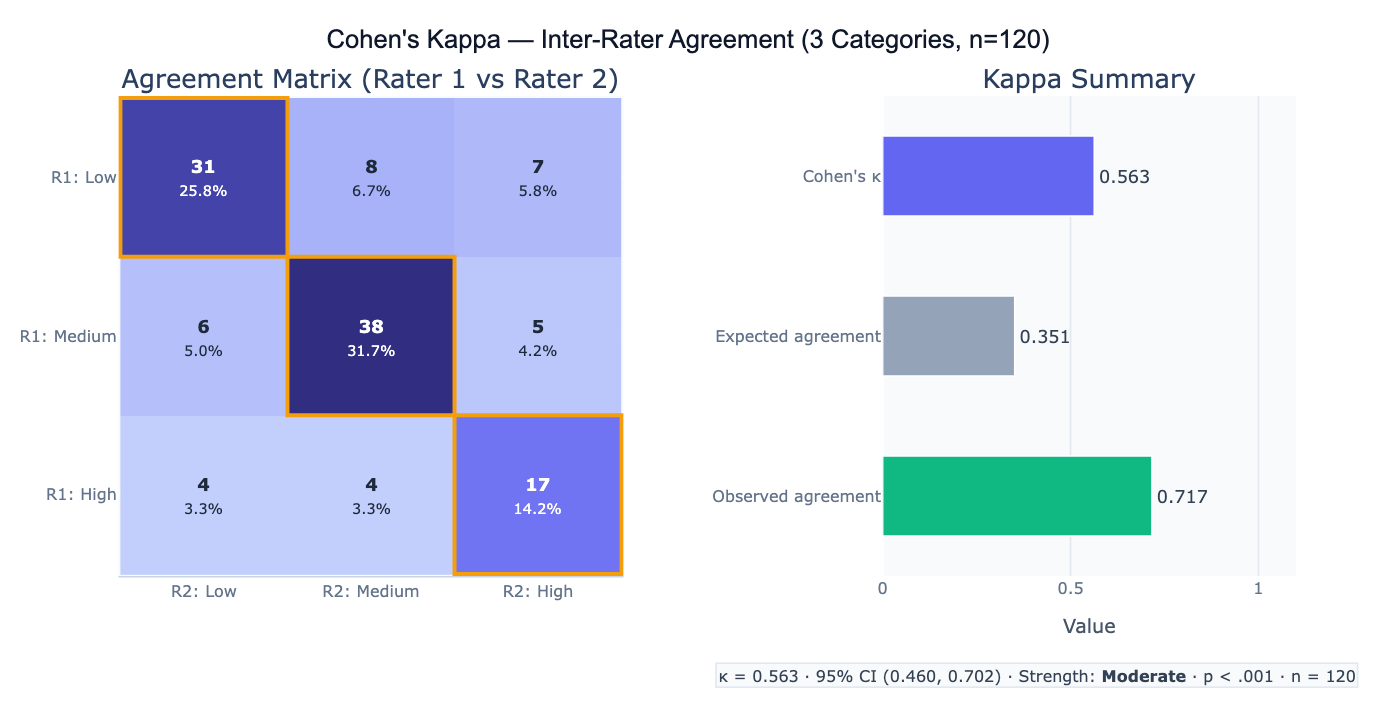 | Basic 2-rater kappa | 2 raters, columns rater1 and rater2; compute Cohen's kappa, 95% CI; agreement matrix heatmap; classify agreement strength |