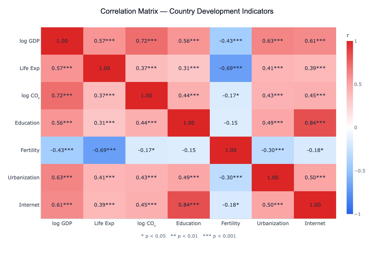 Can I compute partial correlations — controlling for a third variable? Yes — ask for "partial correlation between X and Y controlling for Z". Partial correlation removes the shared influence of control variables and shows the unique linear relationship between two variables. This is especially useful when a confounding variable drives spurious correlations (e.g. GDP driving both CO₂ and life expectancy, making them appear correlated even after controlling for GDP).