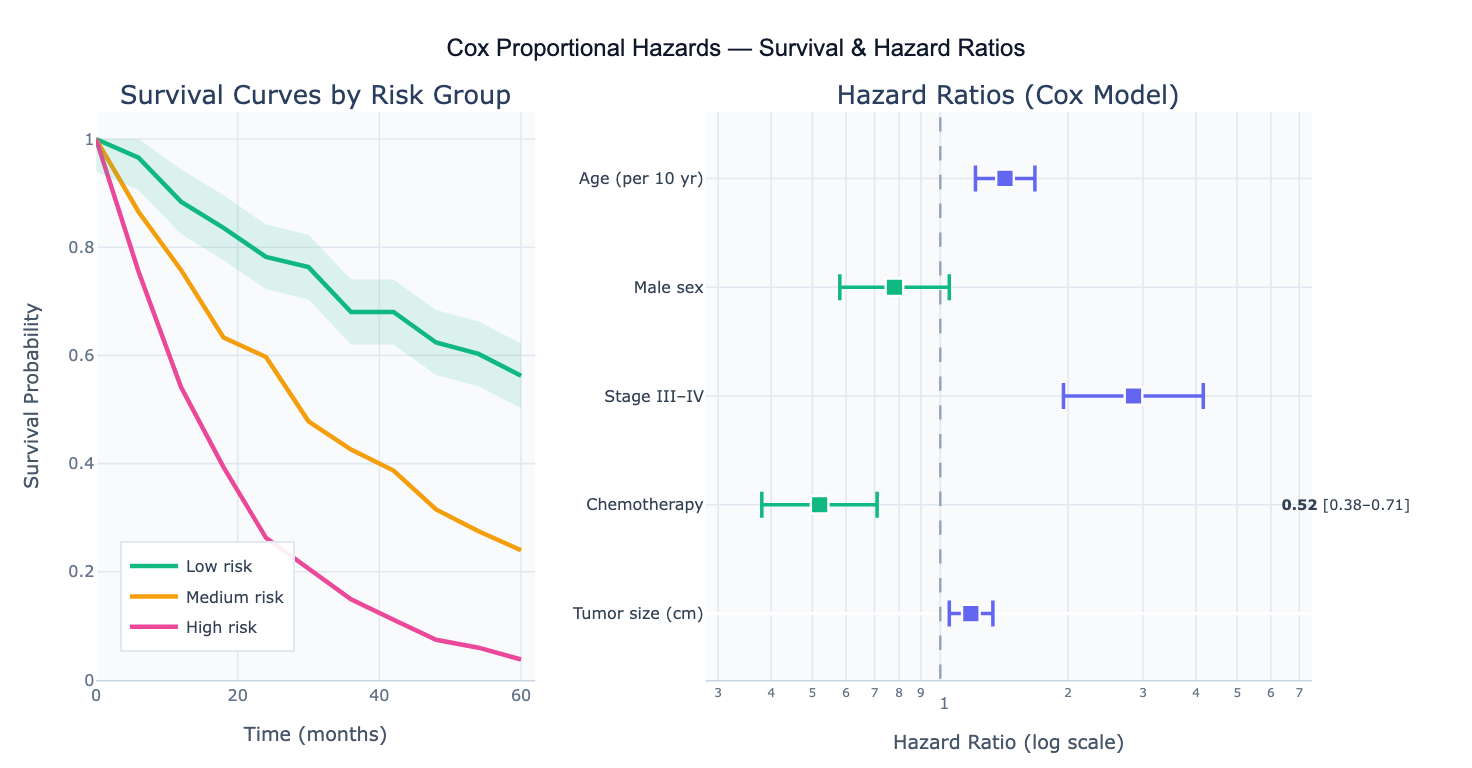 | Forest plot | Visual summary of HRs and 95% CIs — points right of HR=1 are risk factors, left are protective |