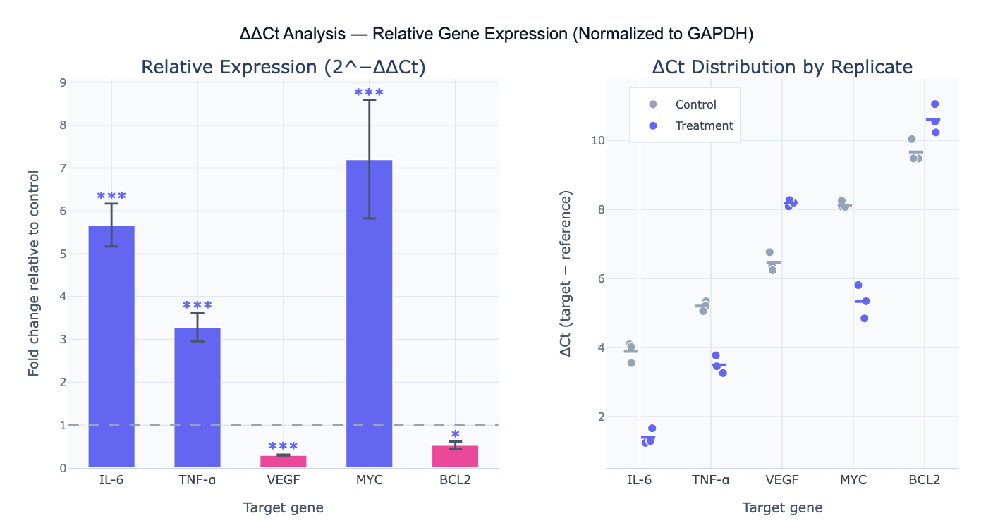 | Multiple conditions | 3 conditions: vehicle, low-dose, high-dose; reference GAPDH; ANOVA on ΔCt with Tukey post-hoc; bar chart with significance brackets |