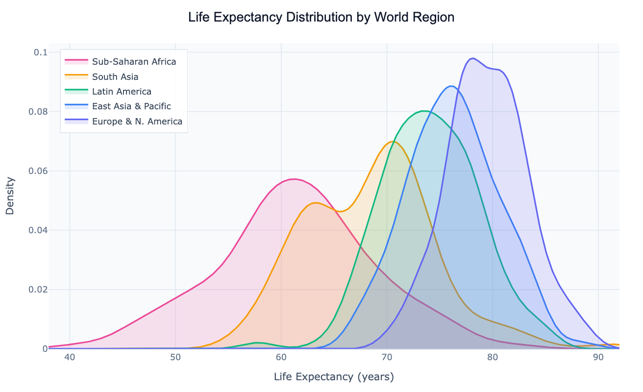 | Regional comparison | density plot of life expectancy by world region, filled curves, label peaks |