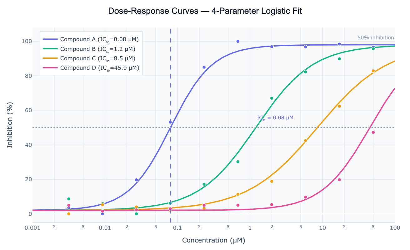 | Single compound | 4PL fit to dose-response data; concentration column 'conc_uM', response 'pct_inhibition'; report IC50 with 95% CI |