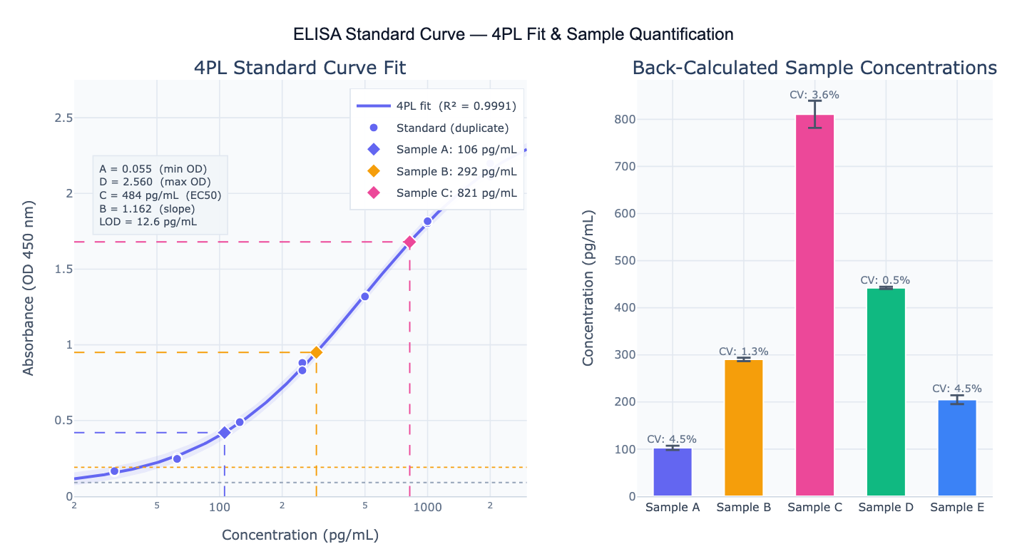 | Full report | fit 4PL; report all parameters, R², LOD, LOQ; back-calculate all unknown samples; flag samples outside dynamic range; compute %CV for replicates |