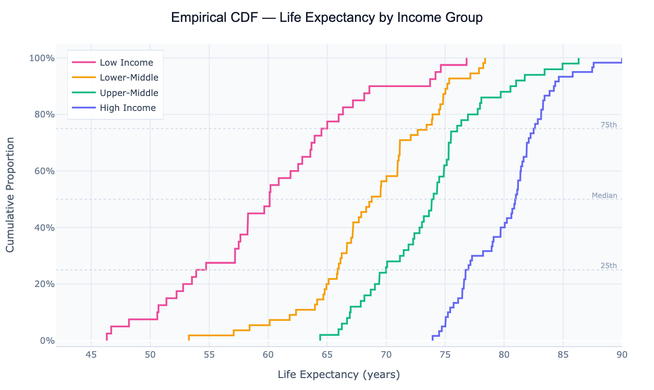 | Vertical gap between curves at the same x | Proportion difference — e.g. "30% more countries in Group A fall below $15k GDP" |