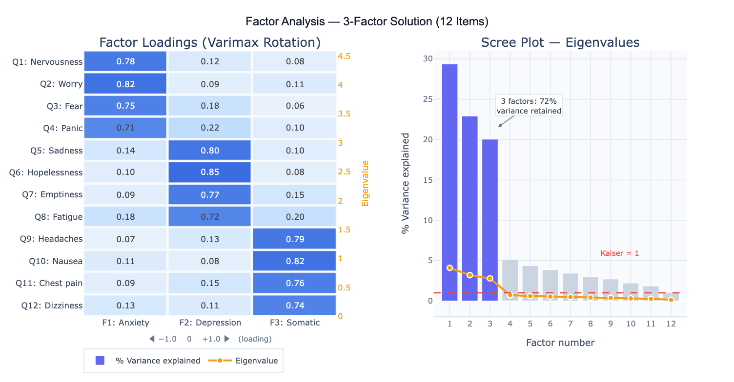 Exploratory factor analysis (EFA) is a statistical method for identifying the underlying latent factors (unobserved constructs) that explain the patterns of correlations among a set of observed variables. The core idea is that if a group of questionnaire items all measure the same latent construct — for example, anxiety — they will correlate with each other, and factor analysis will identify that shared variance as a distinct factor. Unlike observed variables, latent factors cannot be measured directly; they are inferred from the covariances of the items that load on them. EFA is the foundational technique in psychometrics, used to develop and validate scales for intelligence, personality, psychopathology, quality of life, customer satisfaction, and dozens of other constructs.