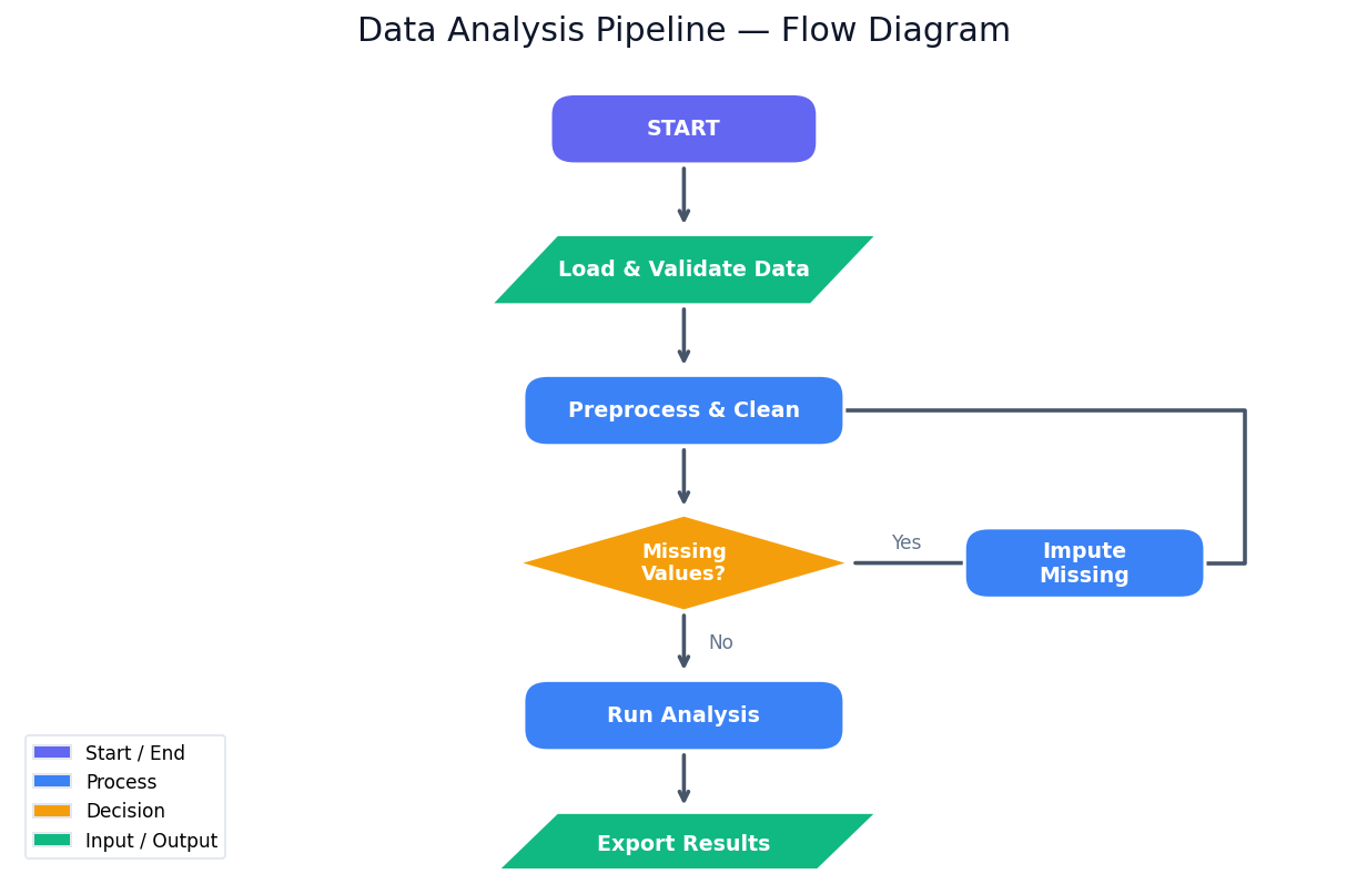 | Data pipeline | flow diagram of a data pipeline: load CSV → validate → clean missing values → normalize → train model → evaluate → save |