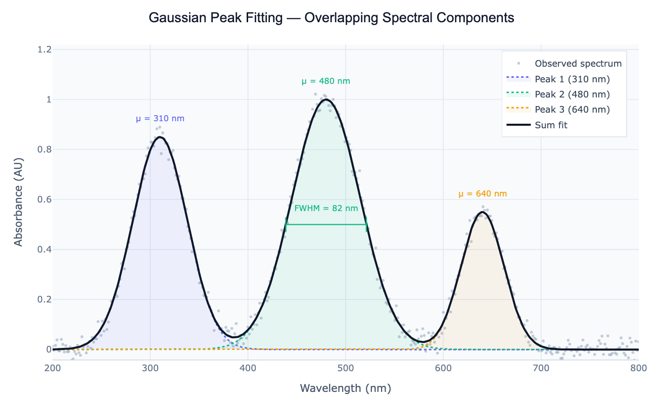 Gaussian peak fitting is the process of modeling a measured signal as the sum of one or more bell-shaped (Gaussian) curves and extracting the parameters of each component: peak center (μ), amplitude (A), and width (σ). A Gaussian peak has the form y = A × exp(−(x − μ)² / (2σ²)), and its full width at half maximum (FWHM = 2.355 × σ) is the most commonly reported width measure. When multiple peaks overlap — as is typical in UV-Vis absorption spectra, fluorescence emission spectra, NMR peaks, chromatography traces, and mass spectra — the individual contributions cannot be read directly from the raw data; nonlinear least-squares fitting deconvolutes them into separate components.