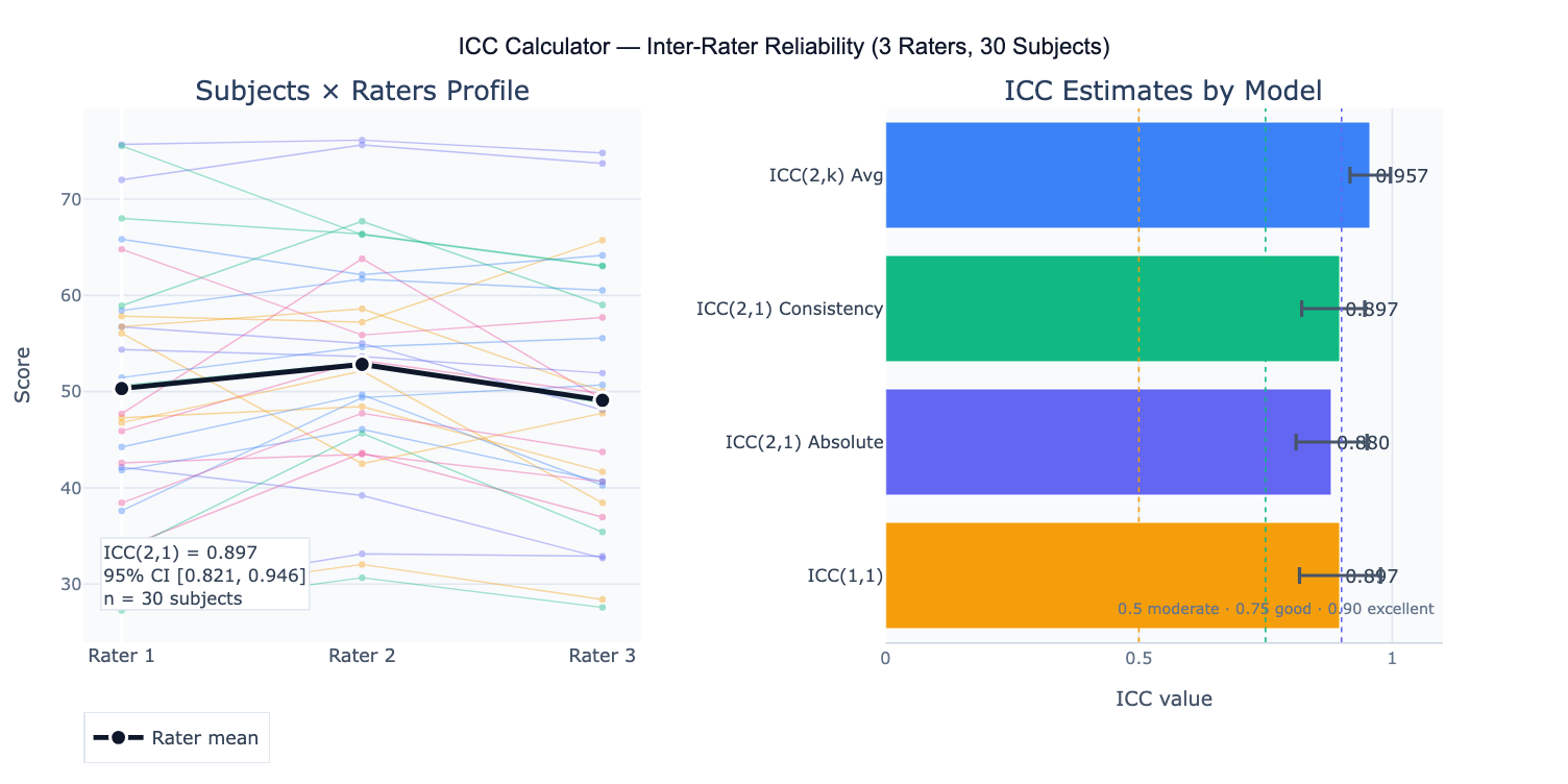Use the Bland-Altman Plot Generator alongside ICC — ICC quantifies the proportion of variance due to subjects, while the Bland-Altman plot visualizes the actual magnitude of disagreement between two measurement methods in original units; for method comparison studies, both are required. Use the Cronbach's Alpha Calculator when items are parallel indicators of a latent construct (psychometric reliability) rather than repeated measurements of the same physical quantity — Cronbach's alpha and ICC(2,k) consistency are mathematically equivalent in the two-way mixed model. Use the Linear Mixed Effects Model Calculator when ICC is a secondary output (the model's random intercept variance / total variance) in a longitudinal study where the primary goal is estimating fixed effects. Use the Power Analysis Calculator to determine sample size needed to estimate ICC with a target CI width.