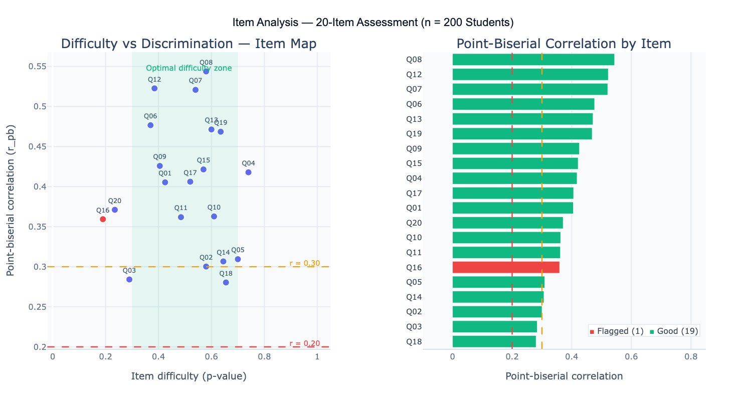 | Basic item analysis | 20 binary items Q1–Q20; item difficulty and point-biserial r; flag r < 0.20; scatter plot; summary table |