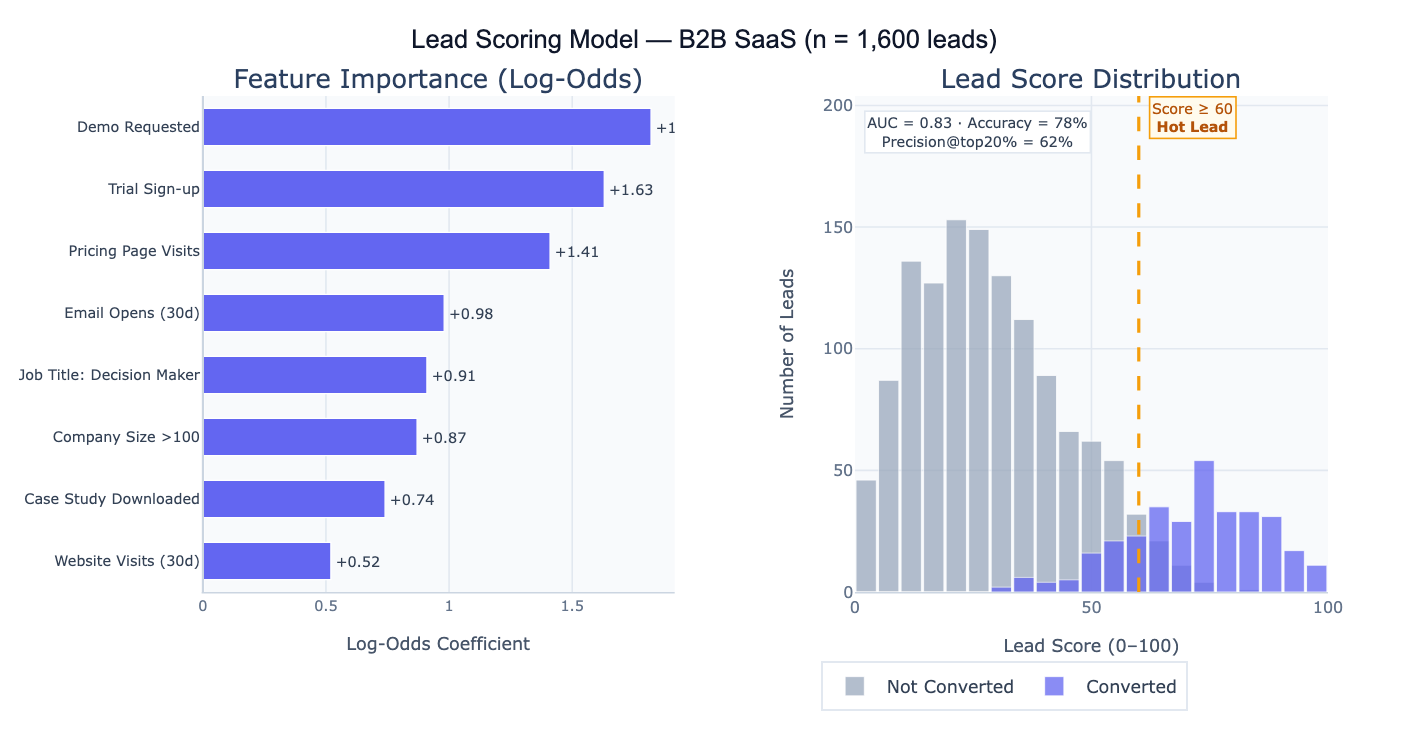 A concrete example: a B2B SaaS company builds a scoring model on 1,600 historical leads (320 converted, 1,280 did not). The model achieves AUC = 0.83, meaning it correctly ranks a randomly chosen converter above a non-converter 83% of the time. Setting a threshold at score ≥ 60, the top 20% of leads capture 62% of all conversions — the sales team can focus on 320 "hot leads" and close 3× as many deals per call as they would working the full list. The feature importance chart shows that "Demo Requested" (+1.82) and "Trial Sign-up" (+1.63) are the strongest predictors, suggesting that the highest-ROI marketing investment is driving prospects to request demos or start trials.
