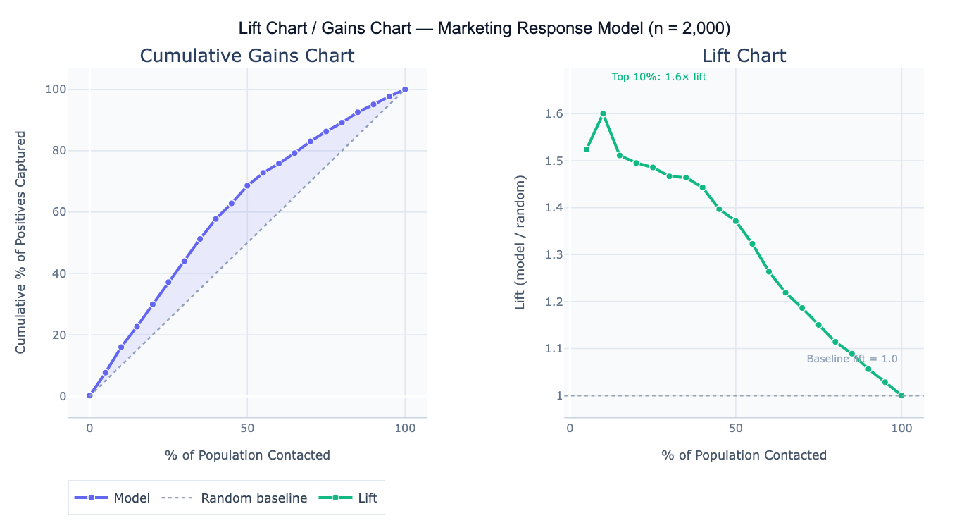 A lift chart (also called a gains chart or cumulative response chart) evaluates how much better a predictive model performs at identifying positive cases compared to random targeting. It answers the question: "If I contact the top X% of people ranked by my model's score, what fraction of all the true positives will I reach — and how does that compare to randomly contacting X% of people?" The chart is the standard tool for assessing targeting efficiency in direct marketing, lead prioritization, health screening, and churn prevention — any context where resources limit how many people can be contacted and you want to maximize the return on each outreach.