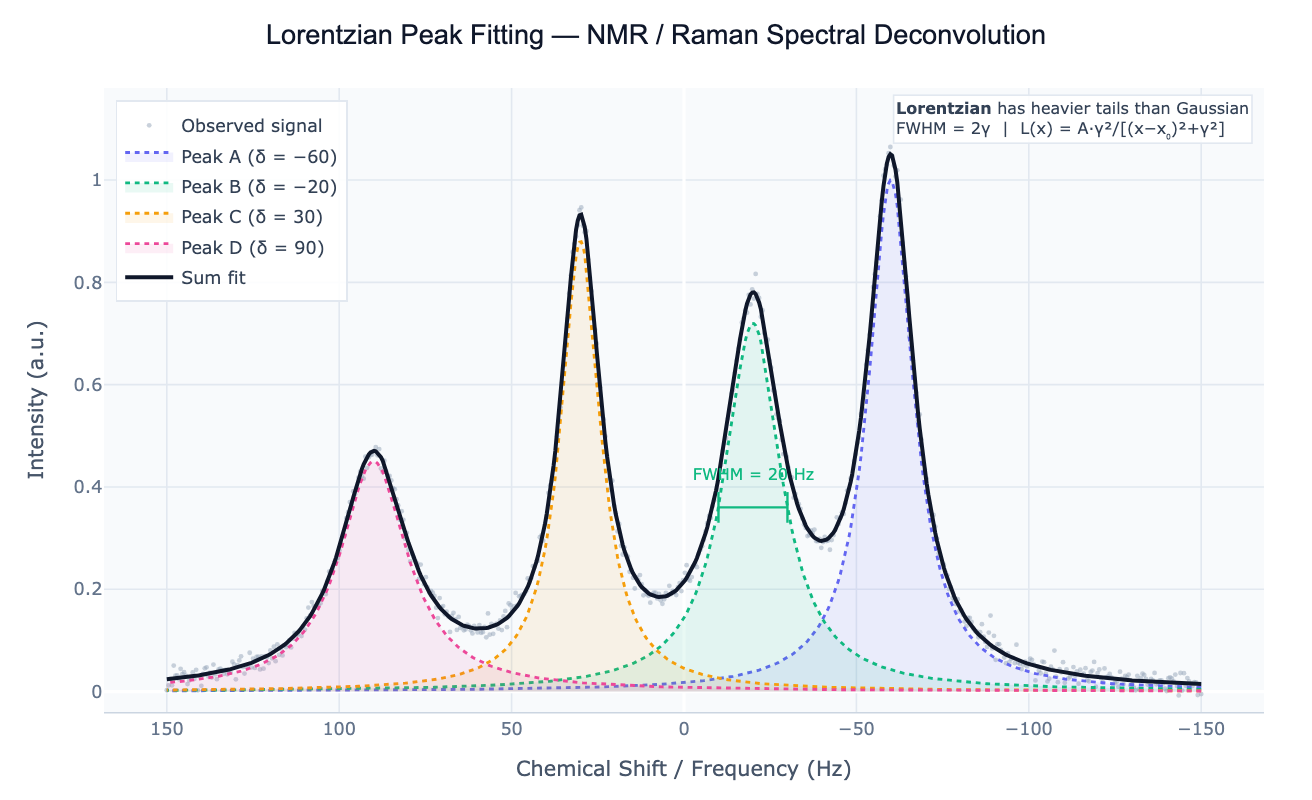 Lorentzian lineshapes arise from homogeneous broadening mechanisms: natural lifetime broadening (governed by the Heisenberg uncertainty principle), collisional broadening in gases, and spin relaxation in NMR. In NMR spectroscopy, every peak in a ¹H, ¹³C, or ³¹P spectrum is a Lorentzian — the linewidth (in Hz) is directly related to the transverse relaxation time T₂ by FWHM = 1/(πT₂). In Raman spectroscopy, phonon modes in crystalline materials produce Lorentzian peaks whose width reports on phonon lifetime and defect density. In resonance physics, the cross-section near a resonance (e.g. optical cavity resonance, atomic absorption line) follows a Lorentzian described by the Breit-Wigner formula. In these contexts, fitting a Gaussian instead of a Lorentzian systematically underestimates the tails and over-estimates narrow linewidths.