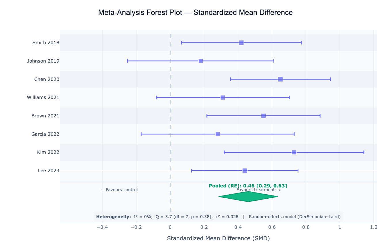 | Basic pooling | random-effects meta-analysis of SMD; DerSimonian-Laird; forest plot; report I², Q, τ² |