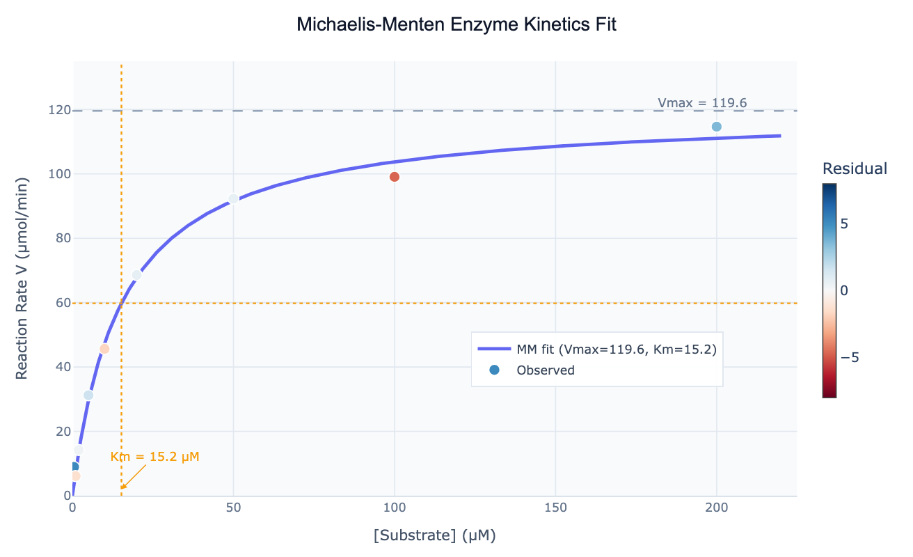 How do I tell if my data actually follows Michaelis-Menten kinetics? Plot V vs S — the curve should be a hyperbola that levels off at Vmax. If the curve is sigmoidal (S-shaped), the enzyme is cooperative and needs the Hill equation. If it has a substrate inhibition hump (decreasing at very high S), the model is V = Vmax×S/(Km + S×(1+S/Ki)). Check the residual plot after fitting — a random scatter confirms MM is appropriate; a systematic S-shaped residual means the wrong model was used.