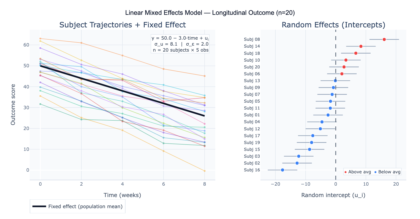 A linear mixed effects model (LMM, also called a multilevel model or hierarchical linear model) extends ordinary linear regression to handle data where observations are not independent — specifically, clustered data (students within schools, patients within hospitals) and repeated measures data (multiple measurements per subject over time). The "mixed" in the name refers to the combination of fixed effects (population-level parameters estimated the same way as in ordinary regression) and random effects (subject- or group-specific deviations from the fixed effects that are modeled as draws from a probability distribution). This structure allows LMMs to correctly account for within-cluster correlation without discarding data from partially-observed subjects.