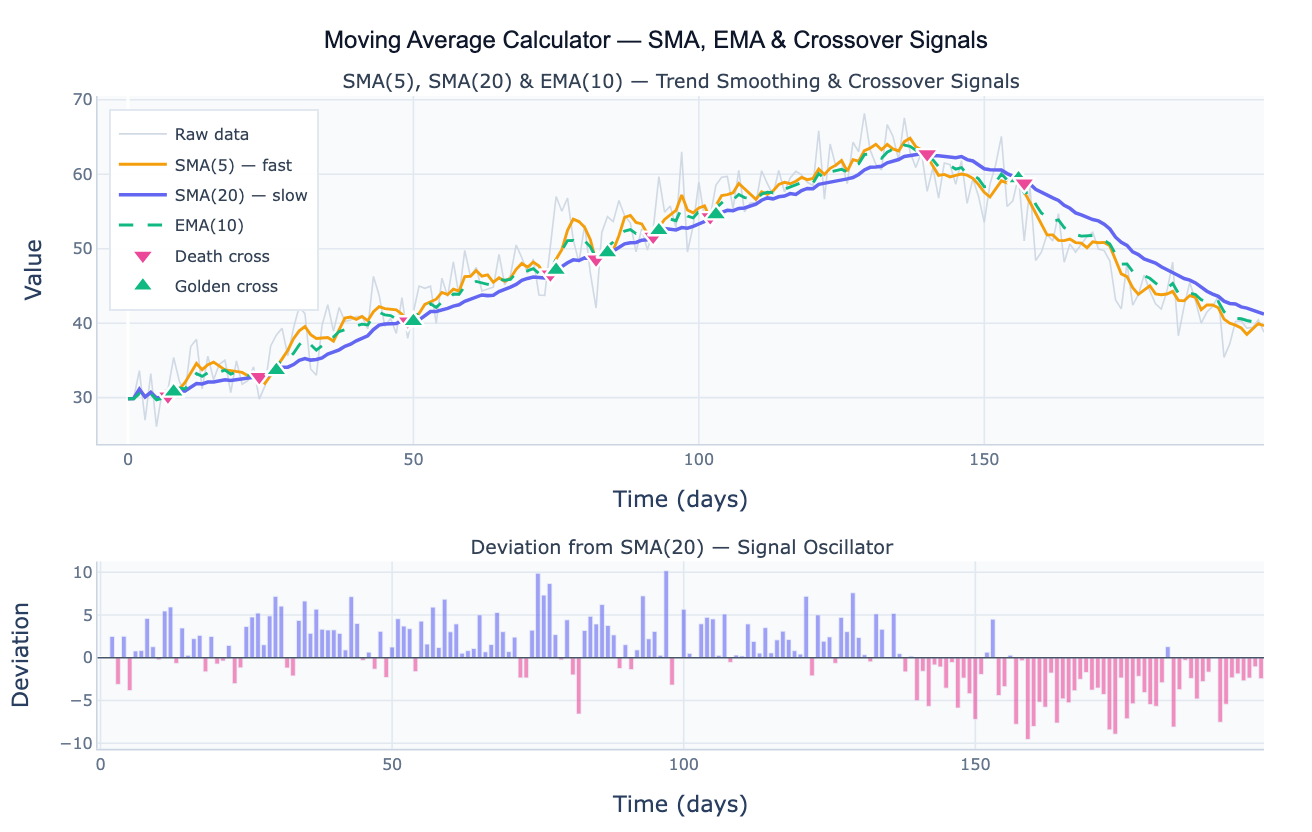 What is a golden cross and should I trust it as a trading signal? A golden cross occurs when a short-window moving average (e.g. SMA-50) crosses above a long-window moving average (e.g. SMA-200), signaling that recent momentum is stronger than the long-run average. A death cross is the reverse. These are widely followed technical indicators in financial markets, but they are lagging signals — they confirm a trend that has already started rather than predicting it, and they generate many false signals in sideways markets. For scientific and business data, crossover signals are most useful as a simple visual marker for regime changes, not as predictive indicators. Always validate against domain knowledge.