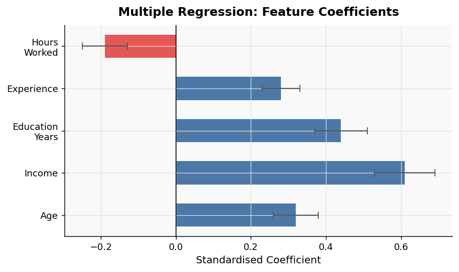 | Coefficient | Change in outcome for a one-unit increase in that predictor, holding all others constant |