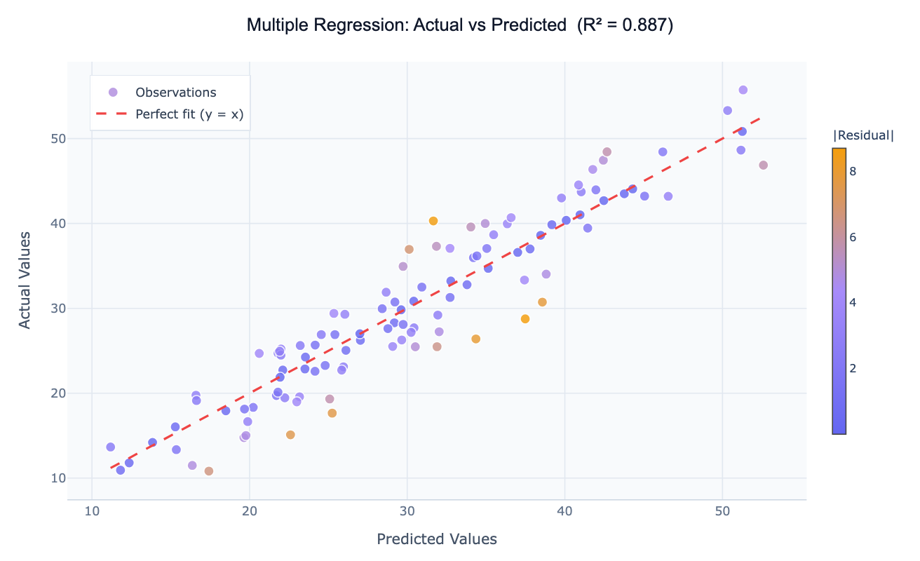 | Adjusted R² | R² penalized for the number of predictors — use this to compare models with different numbers of variables |