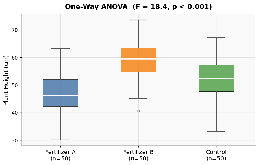 What if my p-value is significant — which groups are different? A significant ANOVA only tells you some groups differ. The Tukey HSD post-hoc test (included automatically) shows exactly which pairs are different.