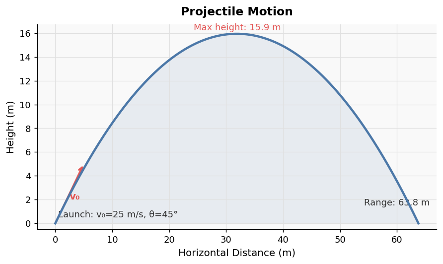 | Kinematics | A ball is thrown upward at 20 m/s. How high does it go and when does it land? |