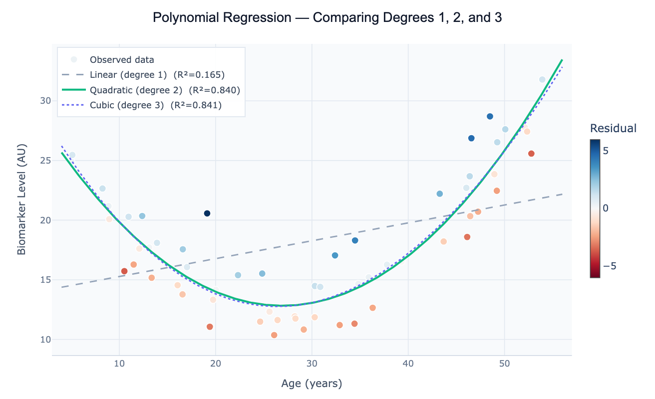 My quadratic coefficient is not statistically significant — should I drop it? If the F-test for the quadratic term (β₂) is not significant (p > 0.05), the data doesn't support curvature at the current sample size. In that case, drop to degree 1 (linear regression). However, be cautious: insufficient statistical power (small n) can mask real curvature. If the residual plot from a linear fit shows a systematic arch, fit the quadratic regardless of p-value and report both models.