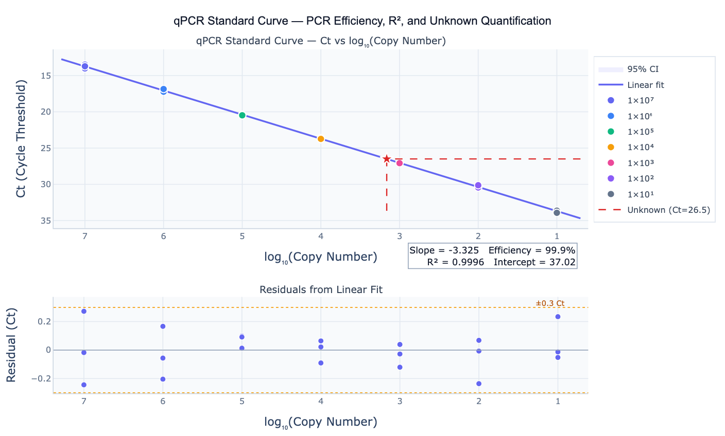 | Basic standard curve | fit standard curve to Ct vs log10(copies); report slope, efficiency, R²; plot with 95% CI band |