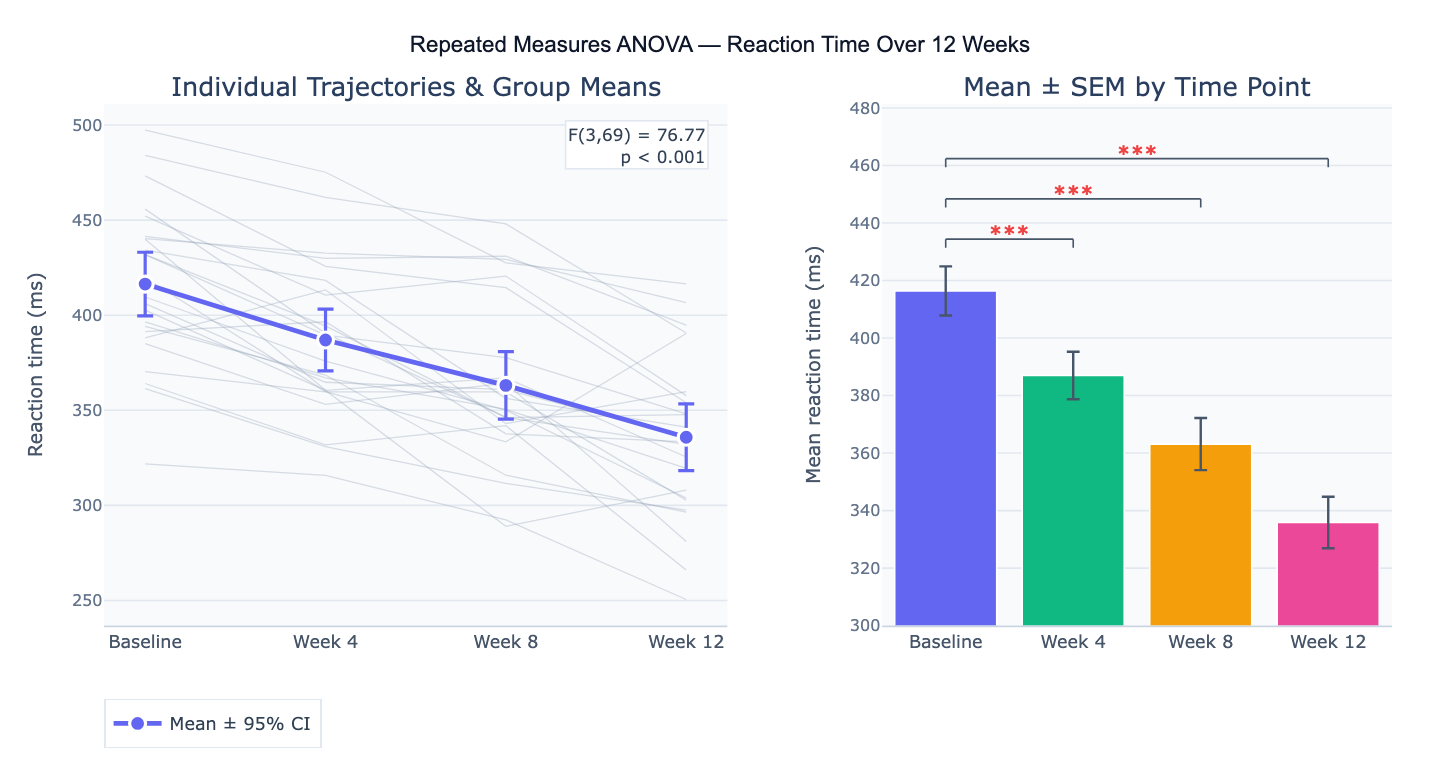 A concrete example: 20 patients complete a cognitive task at baseline and after 4, 8, and 12 weeks of training. A repeated measures ANOVA tests whether mean reaction time differs significantly across the four time points (F(3,57) = 45.2, p < 0.001, η² = 0.70). Post-hoc Bonferroni-corrected comparisons reveal that reaction time improves significantly from baseline to each subsequent time point (all p < 0.01), but the difference between week 8 and week 12 is not significant (p = 0.28), suggesting the training effect plateaus after 8 weeks. The individual trajectory plot reveals that all but 2 participants show consistent improvement, validating the group-level finding.
