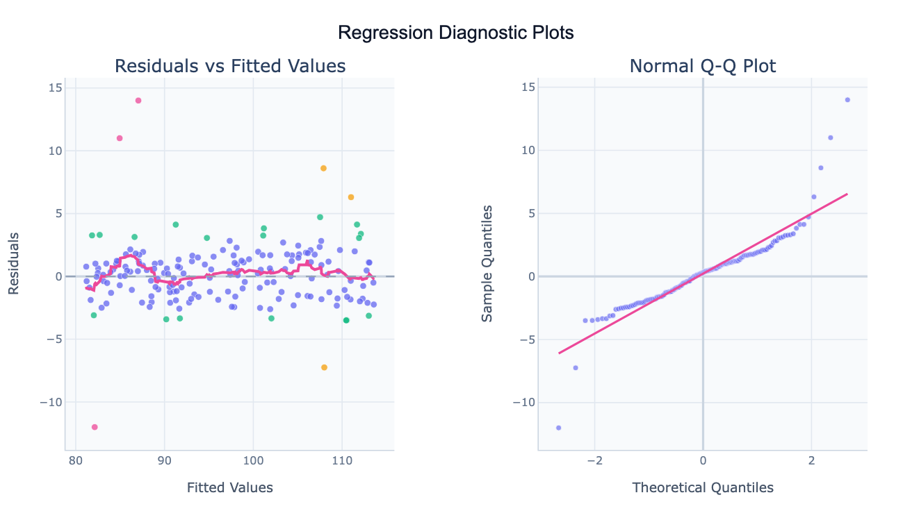 My Q-Q plot has points curving away at both ends — is that a problem? Curving away at both ends (an S-shape) indicates heavy tails — the residuals have more extreme values than a normal distribution would predict. This can affect hypothesis tests if extreme. If the middle of the Q-Q plot is straight, the inference is likely robust. If you have a small sample (< 50), some deviation is expected — focus on severe S-curves or systematic skew.