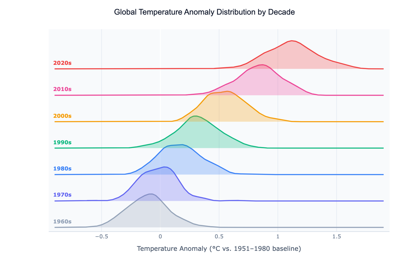 | Climate change | ridgeline plot of temperature anomaly by decade, blue to red gradient, sorted chronologically |