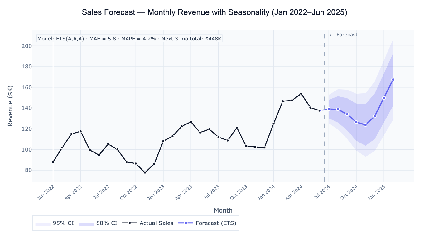 A concrete example: a SaaS company has 30 months of monthly revenue data. ETS(A,A,A) decomposes the series into a +148K to 155K, $182K] by month 6. The expanding uncertainty bands reflect that forecast uncertainty increases with the horizon — the model is confident about next month but less so about 6 months out.
