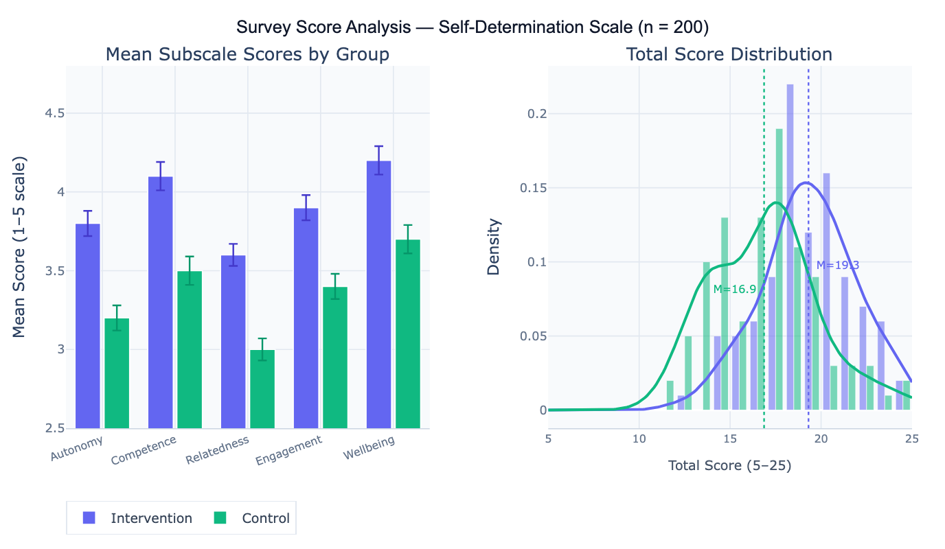 A practical example: a 20-item self-determination scale is administered to 200 students in two conditions. Items 3, 7, and 14 are negatively-worded and must be reverse-coded. After scoring, the intervention group scores significantly higher on the Autonomy subscale (M = 3.8, SD = 0.6) compared to the control group (M = 3.2, SD = 0.7), while the groups do not significantly differ on the Relatedness subscale. The total score distribution reveals that 12% of respondents score below the clinical threshold of 15/25, flagging them for follow-up.