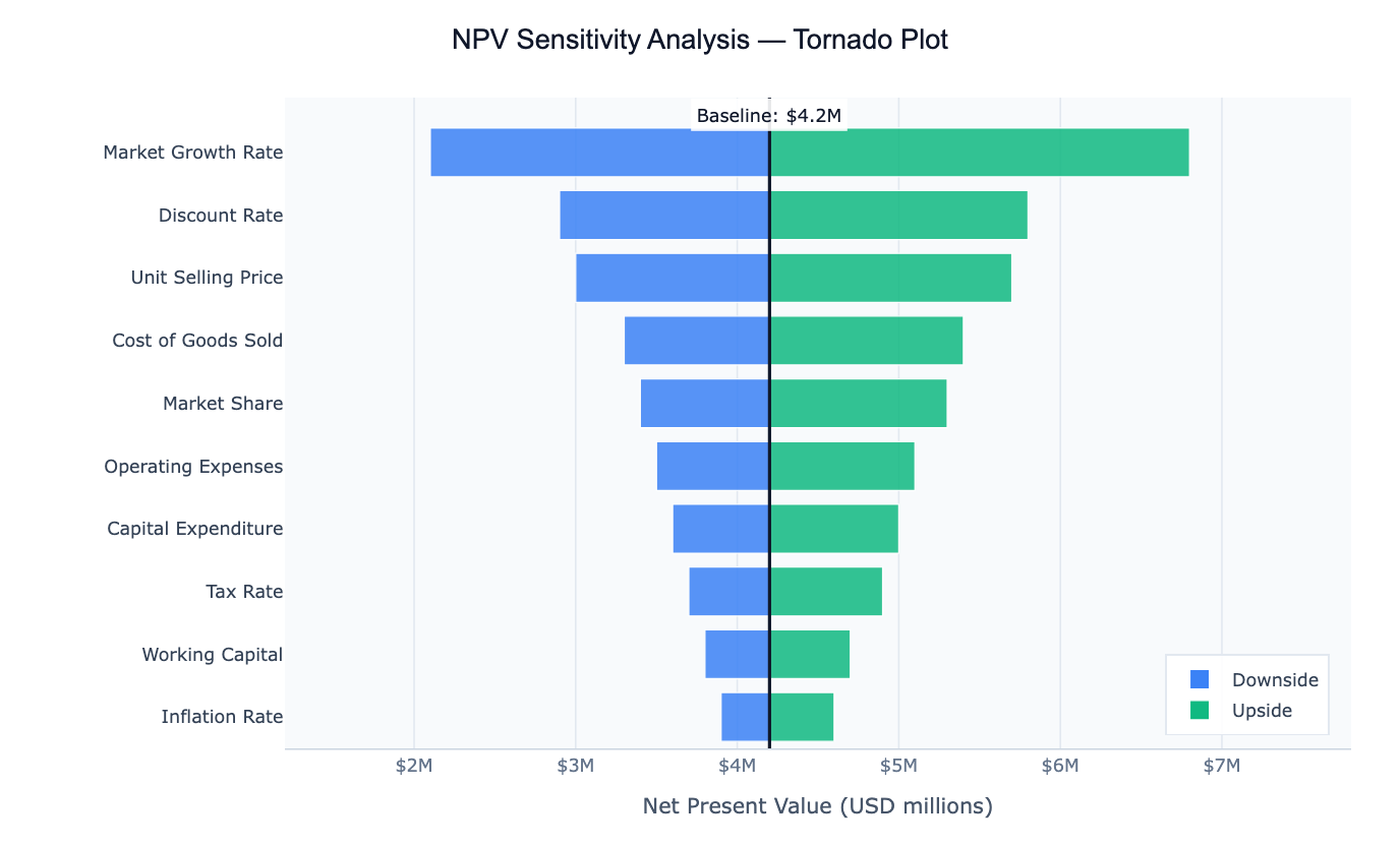 | Financial model | tornado plot of NPV sensitivity, baseline $4.2M, sort by total swing |
