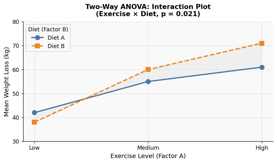 | Interaction (A × B) | Does the effect of Factor A depend on which level of Factor B is present? |